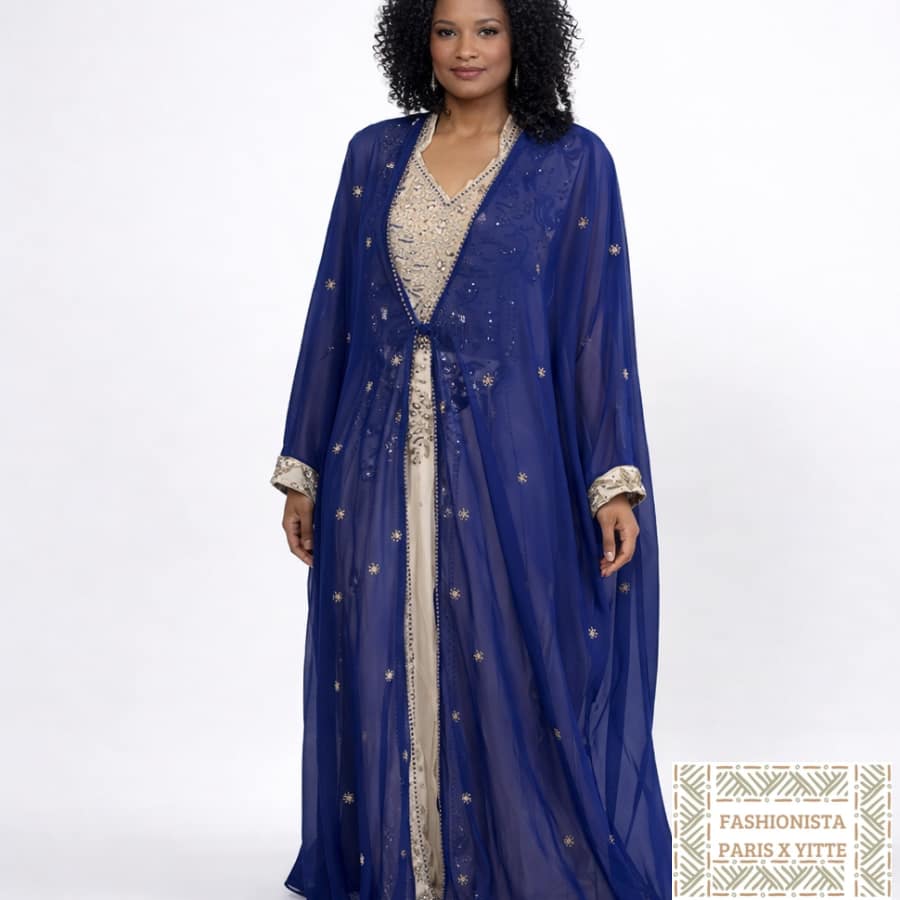 Composé de deux pièces (haut et jupe longue), ce caftan assure une allure majestueuse et un grand confort. La ceinture à lacet ajustable incluse permet de souligner la taille tout en s’adaptant à différentes morphologies, pour une silhouette mise en valeur avec élégance.