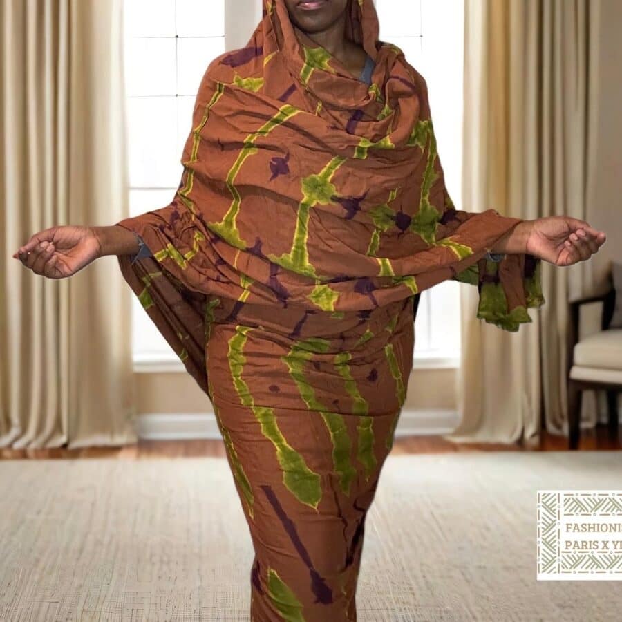 La melhfa, dérivée du mot arabe « lahafa » signifiant couvrir, est une étoffe de 3,50 m qui s’enroule autour du corps, utilisée autrefois par les femmes du Sahara pour se protéger de la chaleur. Aujourd’hui, ce vêtement traditionnel se modernise avec des couleurs unies, des motifs variés, et des effets tie and dye pour tous les goûts.