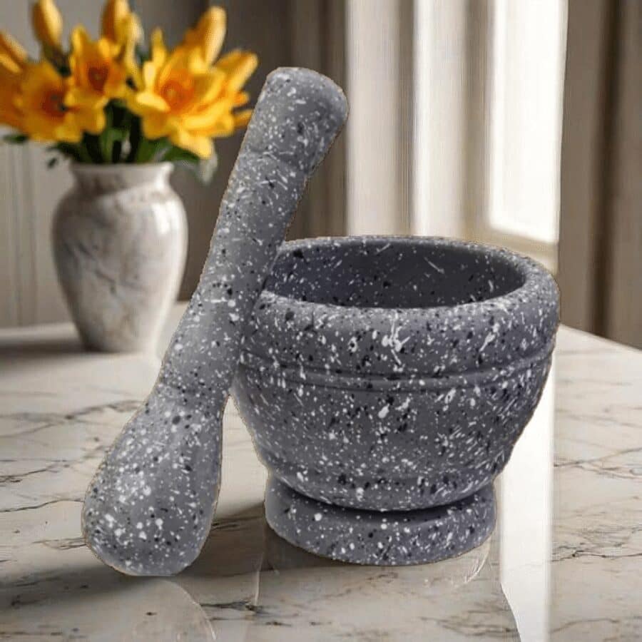 La couleur granit apporte une touche esthétique à votre cuisine, tandis que la forme ergonomique du mortier et du pilon assure une prise en main confortable.
