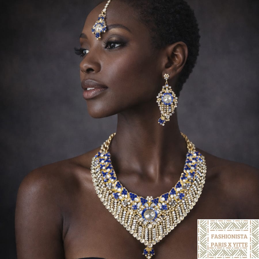 Inspirée par les richesses culturelles de l’Inde, cette parure de bijoux est une déclaration d’un style audacieux. Laissez-vous séduire par ce magnifique ensemble et illuminez vos tenues d’un éclat inoubliable.