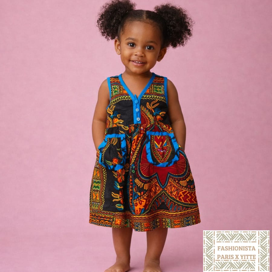 Magnifique robe pour petite fille (3-4 ans), longueur 63 cm. Plusieurs modèles disponibles aux motifs traditionnels africains. Parfaite pour les fêtes, cérémonies ou le quotidien ✨